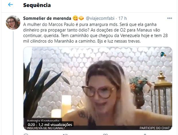 “Não tem outro estado pra mandar oxigênio? Daqui a pouco Manaus não tem onde guardar oxigênio. Ah! vão se fuder pra lá seus vagabundos de merda. Só quem é idiota que entra na onda de vocês. Vão pro caralho”, revolta-se a atriz bolsonarista com todos que se uniram – Gustavo Lima, governo do Pará, Presidente da Venezuela, Nocolás Maduro, o governo da China e tantos outros – para salvar vidas no Amazonas.