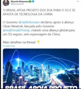 Na mensagem, Eduardo Bolsonaro fez menção à adesão simbólica do Brasil à Clean Network (Rede Limpa), iniciativa diplomática do governo Donald Trump para tentar frear o avanço de empresas chinesas no mercado global de 5G. O filho 03 de Bolsonaro, como é chamado pelo pai, celebrou o fato como um sinal de que o Brasil “se afasta da tecnologia da China”. “O governo Jair Bolsonaro declarou apoio à aliança Clean Network, lançada pelo governo Trump, criando uma aliança global para um 5G seguro, sem espionagem da China”, escreveu o parlamentar, nesta segunda-feira, dia 23. Ele também listou o Partido Comunista Chinês como “entidade agressiva e inimiga da liberdade”.
