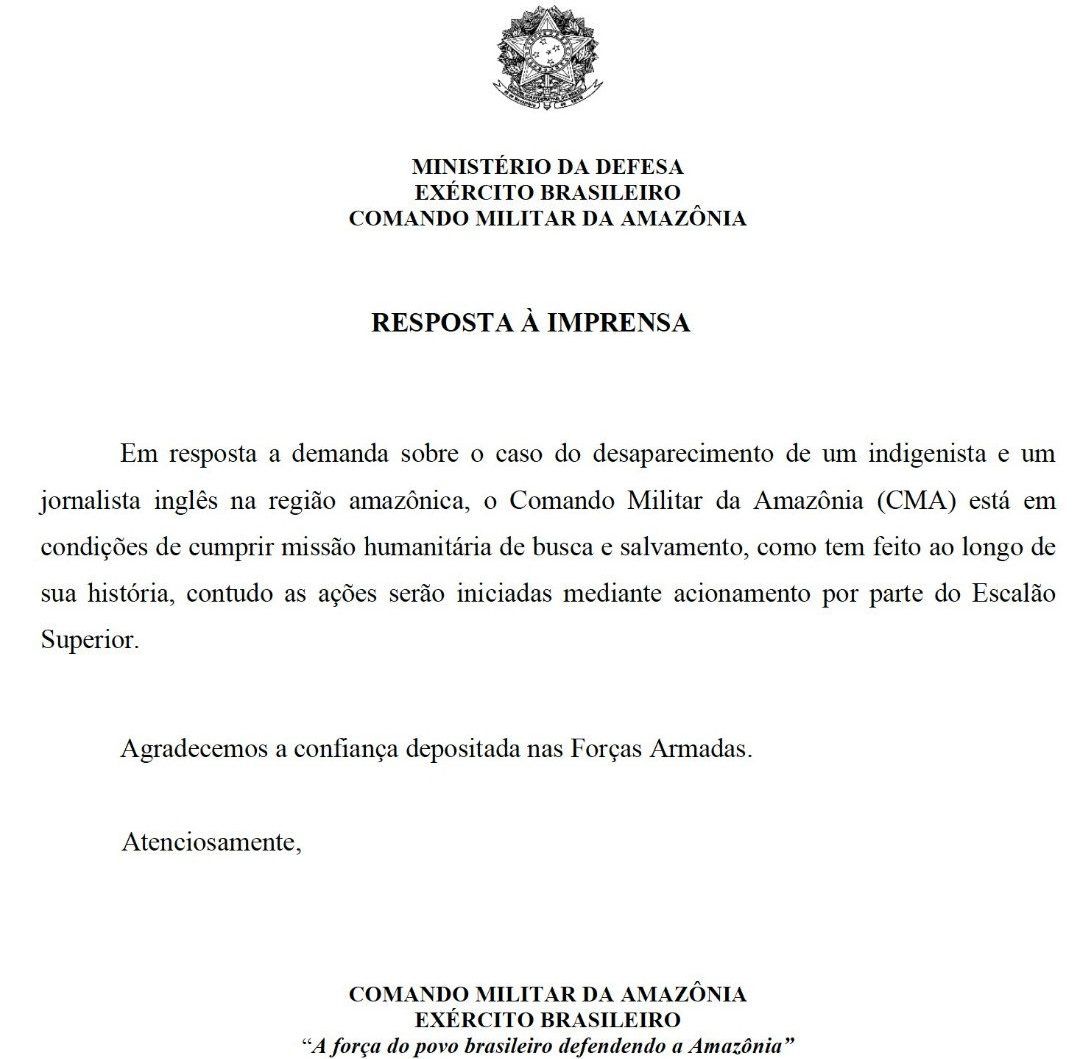 “Em resposta a demanda sobre o caso do desaparecimento de um indigenista e um jornalista inglês na região amazônica, o Comando Militar da Amazônia (CMA) está em condições de cumprir missão humanitária de busca e salvamento, como tem feito ao longo de sua história, contudo as ações serão iniciadas mediante acionamento por parte do Escalão Superior”, diz o comunicado.