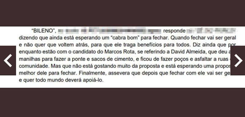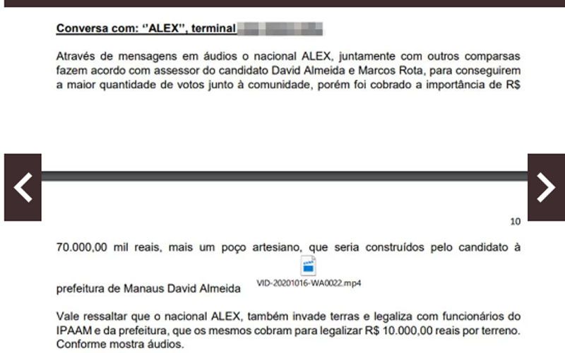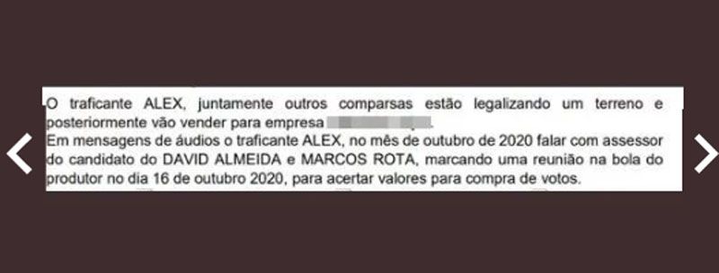 Um dos diálogos traz como personagem o gerente do tráfico de drogas de Bileno, conhecido como Alex. No áudio, ele fala de supostos acordos com David e Marcos Rotta (PP), atualmente prefeito e vice-prefeito de Manaus.