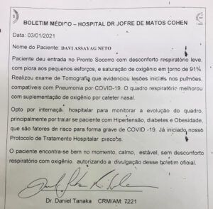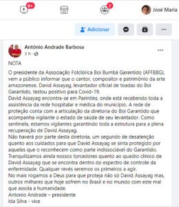 O cantor e levantador de toadas do Boi Garantido, David Assayag, testou positivo para Covid-19, segundo boletim médico expedido pelo hospital Dr. Jofre de Matos Cohen, em Parintins, e assinado neste domingo, 03, pelo médico Daniel Tanaka, CRM 7221.