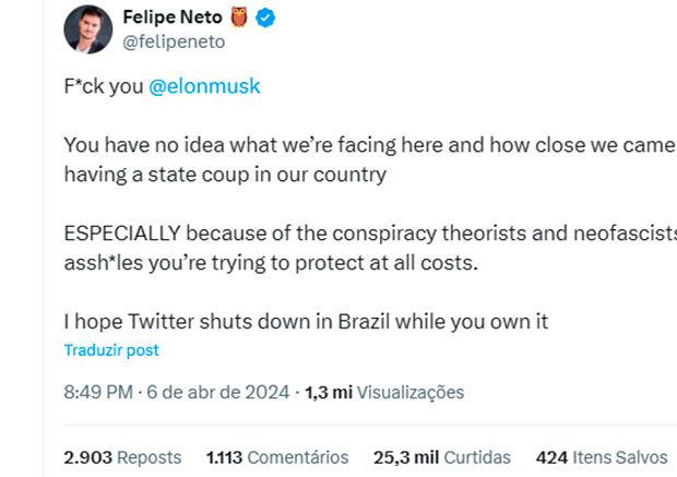 “Foda-se, Elon Musk. Você não tem ideia do que estamos enfrentando aqui e quão perto estivemos de um golpe de estado em nosso país. Especialmente por causa dos teóricos da conspiração e idiotas neofascistas que você está tentando proteger a todo custo. Espero que o Twitter feche no Brasil enquanto você o possui”, postou o influenciador Felipe Neto em suas redes sociais.