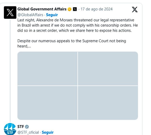 No dia 17 de agosto, a conta Global Government Affairs do X acusou Moraes de ameaçar de prisão seus funcionários e, diante disso, anunciou o encerramento de suas operações no Brasil.