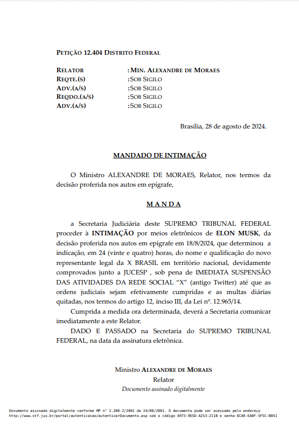 O ministro Alexandre de Moraes, do Supremo Tribunal Federal (STF), intimou na noite desta quarta-feira (28) o bilionário Elon Musk, dono do X (antigo Twitter).