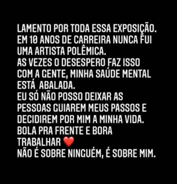 Mais cedo, a cantora também usou as redes sociais para negar a informação de que teria feito uma festa na casa de sua mãe para Guimê durante a madrugada. Foi quando Lexa fez o primeiro desabafo do dia : “Não é possível que eu estou sendo condenada por não ter feito nada”, publicou Lexa.