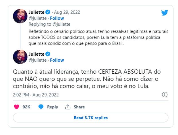 Com uma sequência de postagens no Twitter, onde possui mais de 5,6 milhões de seguidores, Juliette relembrou sua trajetória humilde para dizer que Lula é quem “mais condiz” com o que pensa para o país.