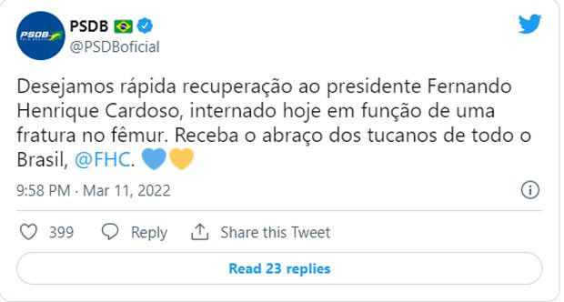 “Desejamos rápida recuperação ao presidente Fernando Henrique Cardoso, internado hoje em função de uma fratura no fêmur. Receba o abraço dos tucanos de todo o Brasil”, diz o texto.