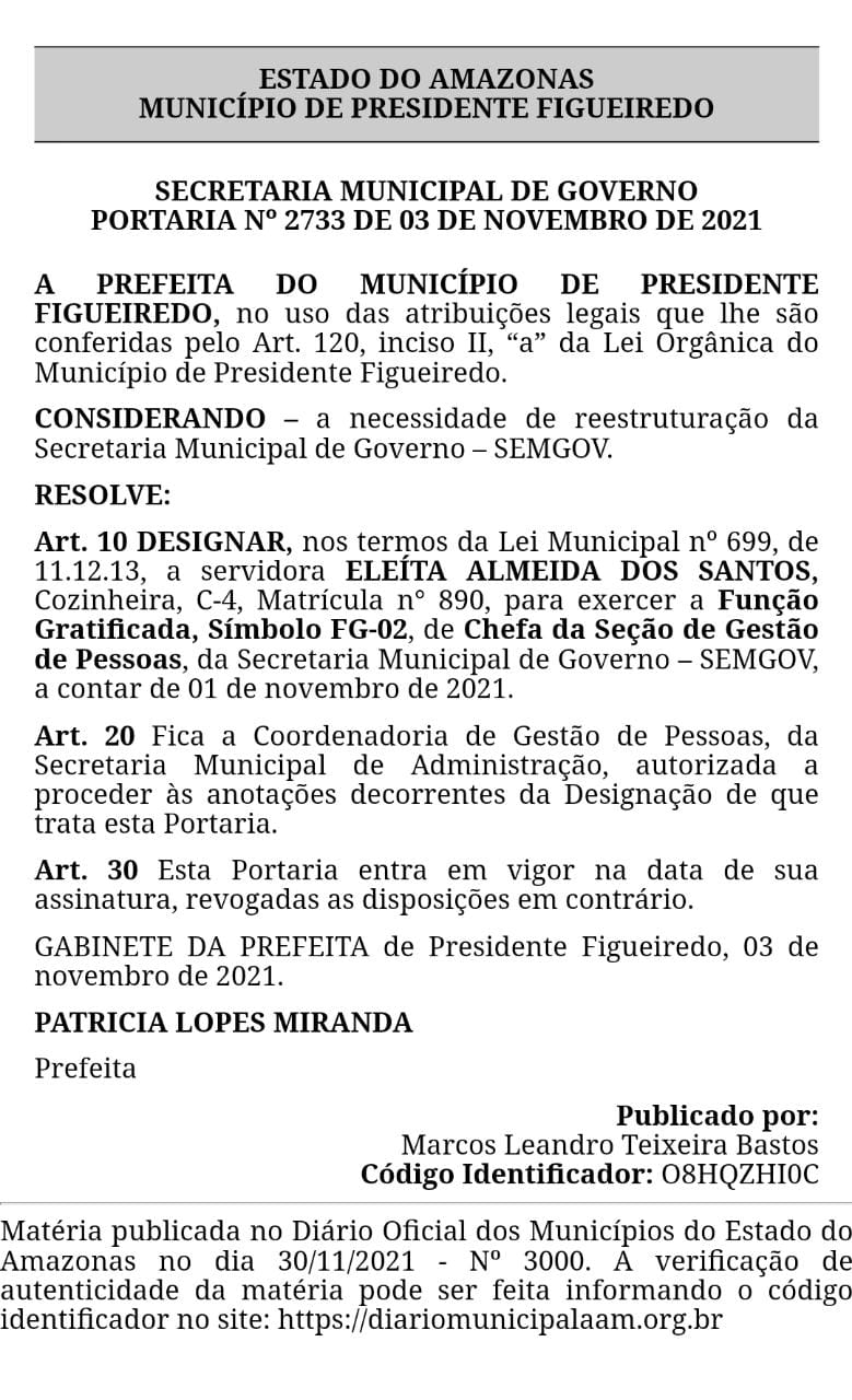 Eleita de Almeida que é servidora da prefeitura, matriculada com o nº 699 e cadastrada como cozinheira C-4, foi nomeada, agora, para o a função gratificada, símbolo FG-02, de chefa da Seção de Gestão de Pessoas da Secretaria Municipal de Governo – SEMGOV.