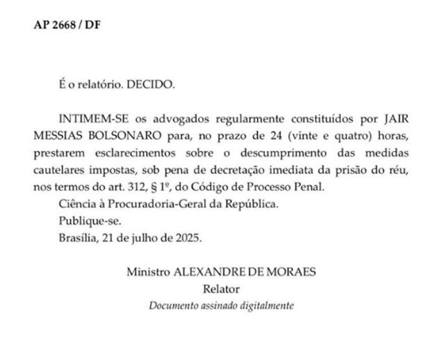 “Intimem-se os advogados regularmente constituídos por Jair Messias Bolsonaro para, no prazo de 24 (vinte e quatro) horas, prestarem esclarecimentos sobre o descumprimento das medidas cautelares impostas, sob pena de decretação imediata da prisão do réu”, determina o ministro.