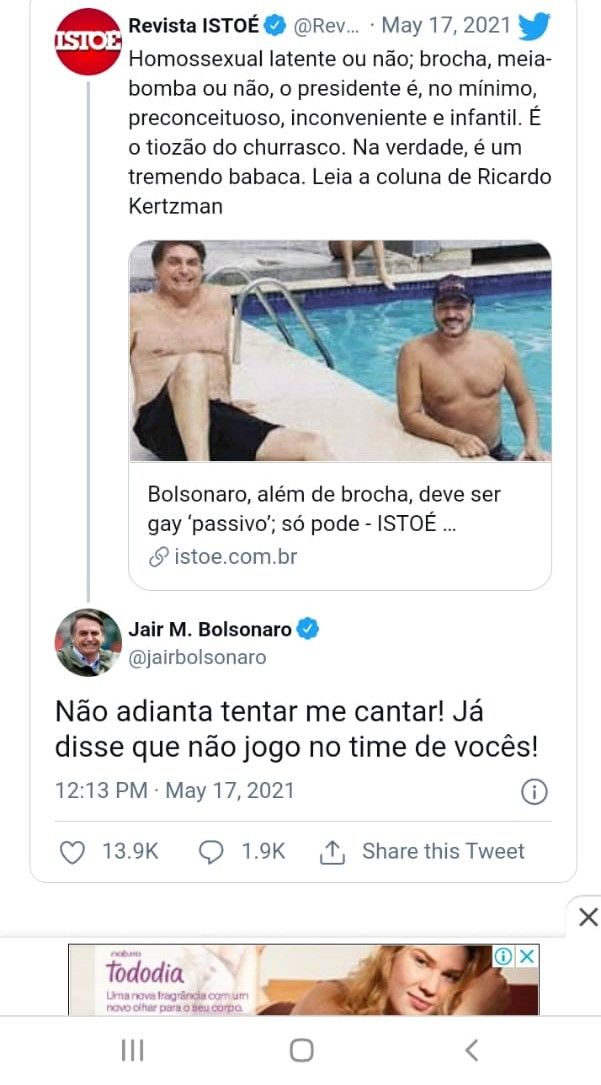 No Dia Internacional contra a Homofobia, Jair Bolsonaro usou as redes sociais para trocar farpas com o colunista da Revista Istoé Ricardo Kertzman, que publicou um artigo criticando os ataques homofóbicos feitos pelo ex-capitão intitulado: “Bolsonaro, além de brocha, deve ser gay ‘passivo’; só pode”. “Não adianta tentar me cantar! Já disse que não jogo no time de vocês!”, postou Bolsonaro nas redes sociais.