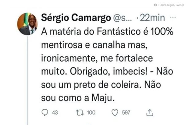 Sérgio Camargo ataca a Globo e ofende a jornalista Maju Coutinho: “Não sou um preto de coleira. Não sou como a Maju…”. A publicação foi apagada alguns minutos depois.