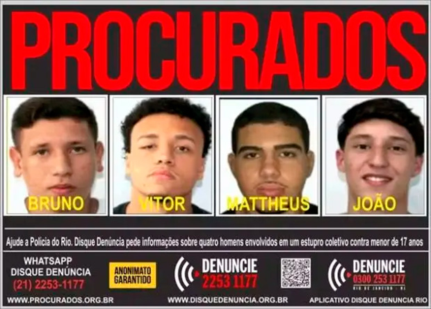 Dois dos quatro foragidos acusados de participar do estupro coletivo de uma adolescente de 17 anos em Copacabana se entregaram à polícia nesta terça (3). Mattheus Verissimo Zoel Martins e João Gabriel Xavier Bertho, ambos de 19 anos, se apresentaram com suas defesas em delegacias da Zona Sul do Rio.
