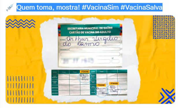 O ex-prefeito Arthur Neto (PSDB) exibiu no Twitter, dia 25, às 06h04 PM (da tarde), o seu cartão de vacina contra covid-19, que atesta que ter recebido as três doses recomendadas pelos organismos de saúde. Mas não foi só. Na legenda Arthur escreveu ardilosamente “Quem toma, mostra! #VacinaSim #VacinaSalva” (ver foto abaixo).