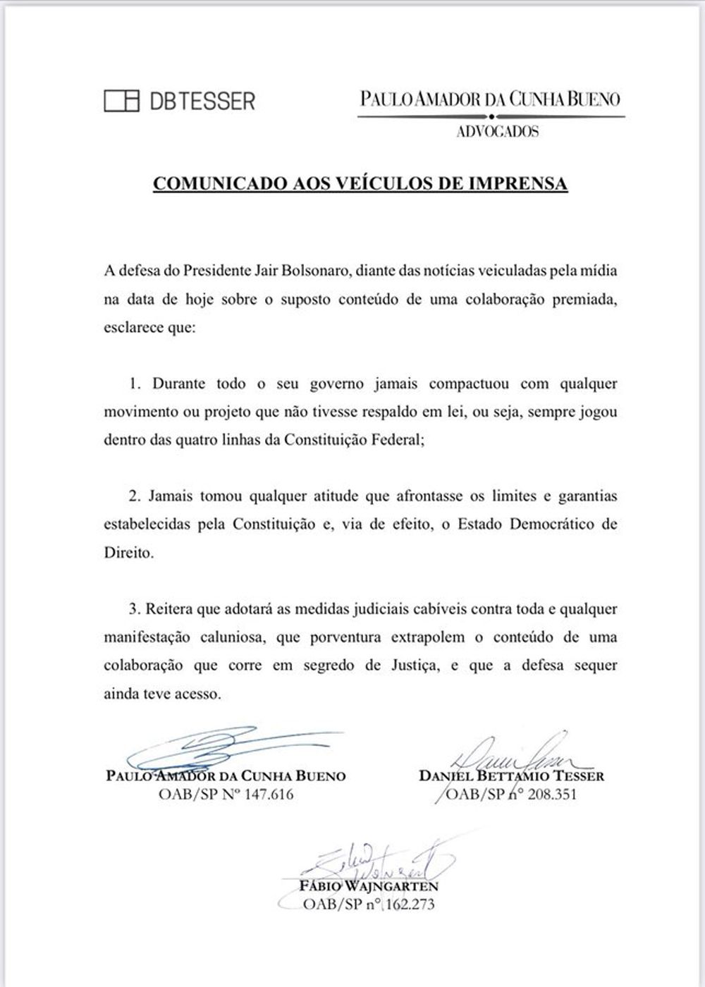 “A defesa do Presidente Jair Bolsonaro, diante das notícias veiculadas pela mídia na data de hoje sobre o suposto conteúdo de uma colaboração premiada, esclarece que: 1. Durante todo o seu governo jamais compactuou com qualquer movimento ou projeto que não tivesse respaldo em lei, ou seja, sempre jogou dentro das quatro linhas da Constituição Federal”, diz a nota divulgada à imprensa.