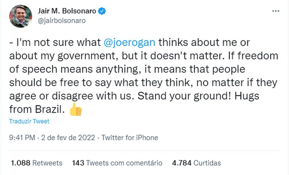 “Não sei o que Joe Rogan pensa sobre mim ou sobre o meu governo, mas não importa. Se liberdade de expressão significa alguma coisa, significa que pessoas devem ser livres para dizer o que quiserem, concordando ou discordando de nós. Fique firme! Abraços do Brasil”, escreveu Bolsonaro, em tradução livre.