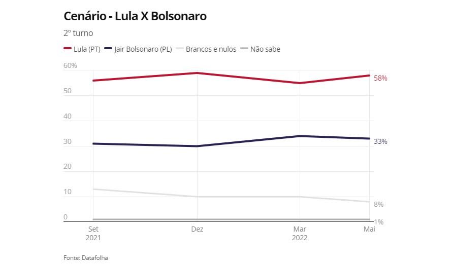 Segundo o Datafolha, a intenção de voto em Lula em um eventual segundo turno é de 58%, enquanto a de Bolsonaro é de 33%. A diferença entre os dois é de 25 pontos percentuais.