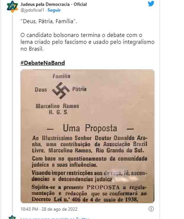 Jair Bolsonaro voltou a usar o slogan “Deus, Pátria, Família”, criado pelo fascismo, em suas considerações finais no primeiro debate entre presidenciáveis na noite deste domingo (28).