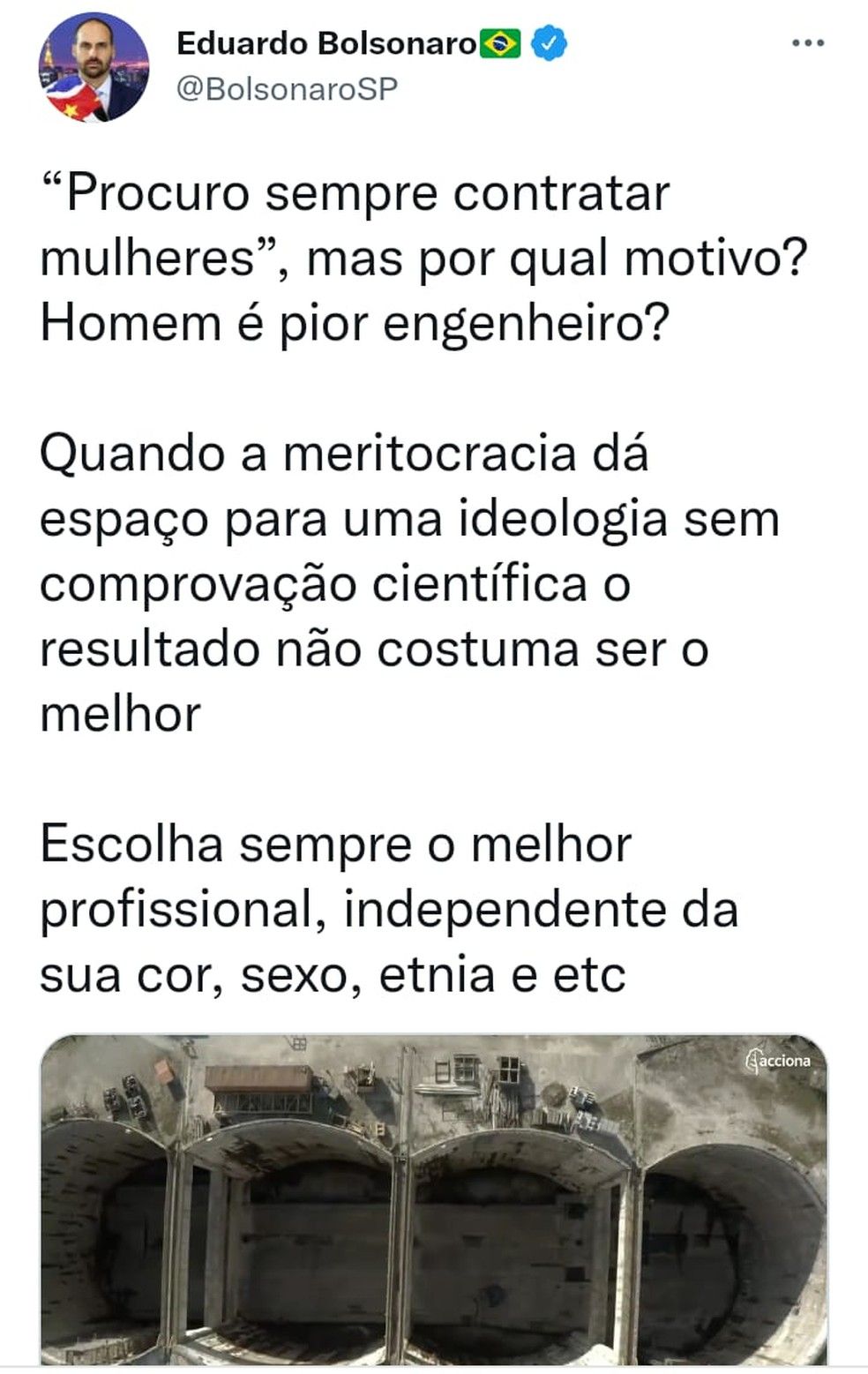 O filho do presidente da República, Jair Bolsonaro (PL), postou no Twitter o vídeo que relaciona a cratera provocada por um acidente envolvendo o tatuzão das obras da linha do Metrô na Marginal Tietê com uma entrevista em que Stefania Riciulli, coordenadora de comunicação da Acciona, que defende a contratação de mulheres na empresa.