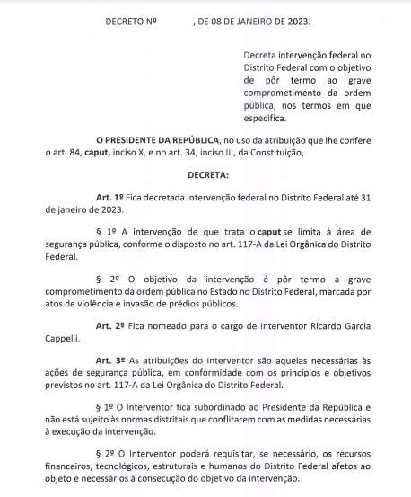 Para o cargo de interventor foi nomeado o secretário-executivo do Ministério da Justiça, Ricardo Cappelli. Ele estará subordinado ao presidente. Com a medida, as Forças Armadas poderão atuar na capital federal para a retomada da ordem pública.