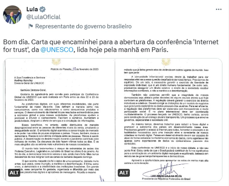 O presidente Luiz Inácio Lula da Silva (PT) encaminhou, na manhã desta quarta-feira (22), uma carta que foi lida na abertura da conferência “Internet for trust”, evento da UNESCO (Organização das Nações Unidas para a Educação, a Ciência e a Culura) que tem como objetivo combater a desinformação e o discurso de ódio na internet.