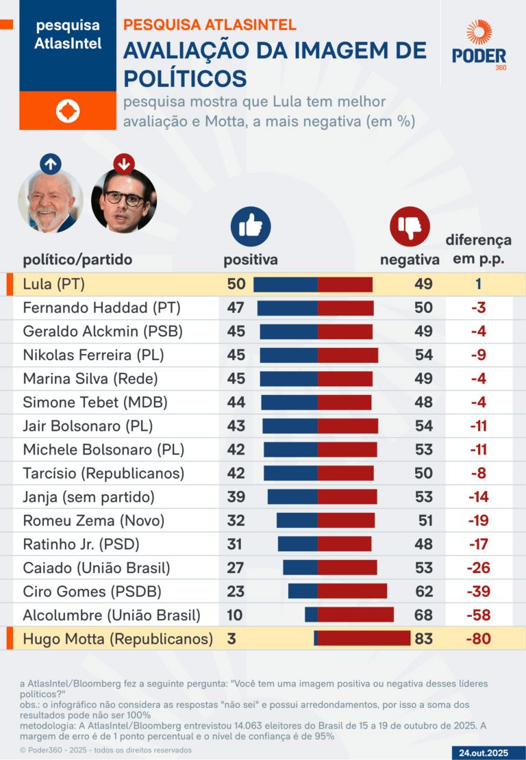 A pesquisa Atlas Intel ouviu 14.063 brasileiros adultos entre 15 e 19 de outubro de 2025, com recrutamento digital aleatório (Atlas RDR). A margem de erro é de um ponto percentual, para mais ou para menos.