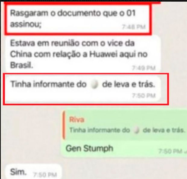 Rivas: “Estou escutando a história do Mourão e estou abismadooooooo (sic). Fora os outros GEN [generais]. Na reunião com o 01 [Bolsonaro] e o que eles fizeram. Que o Mourão negociou com outros generais a saída do 01, falando que o Peru era logo ali. Rasgaram o documento que o 01 assinou. Estava em reunião com o vice da China com relação à Huawei aqui no Brasil. Tinha informante do ?[emoji de ovo] de leva e trás (sic)”.