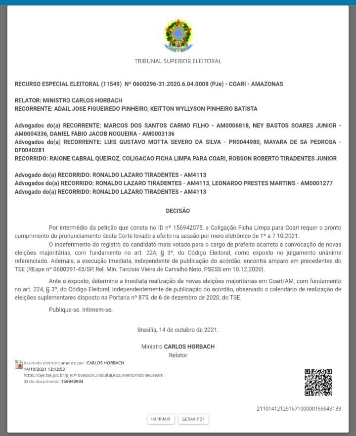 O Ministro do Tribunal Superior Eleitoral (TSE), Carlos Horbach, determinado nesta quinta-feira (14), a imediata realização de novas eleições no município de Coari.