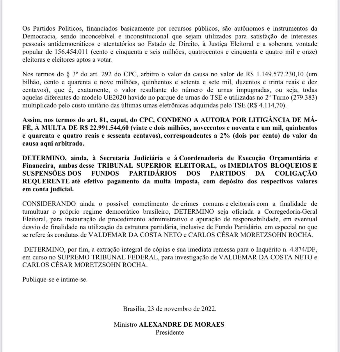 Moraes rejeitou o pedido de verificação extraordinária do resultado das eleições 2022 e definiu a multa de R$ 22.991.544,60 por identificar, na conduta dos partidos, “litigância de má-fé” – quando alguém aciona a Justiça com má intenção ou deslealdade, para causar tumulto.