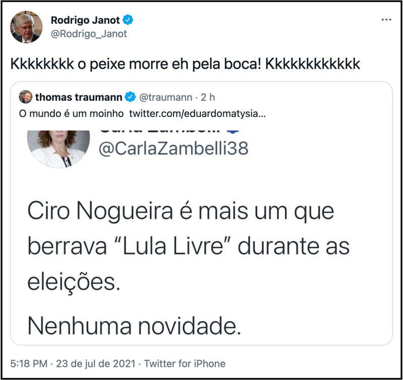 O ex-procurador-geral da República, Rodrigo Janot, respondeu nesta 6ª feira (23.jul.2021), em tom de deboche, uma publicação no Twitter que resgatava uma crítica da deputada federal Carla Zambelli (PSL-SP) ao senador Ciro Nogueira. Segundo ele, “o peixe morre é pela boa”.