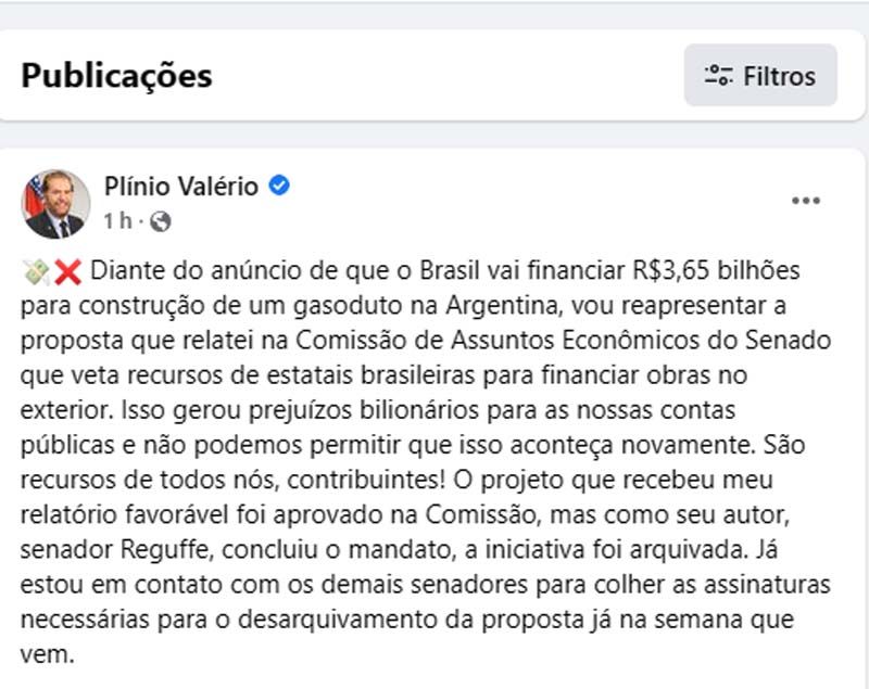 Pérola delirante – Plínio Valério pretende barrar empréstimo do BNDES para construção de gasoduto na Argentina