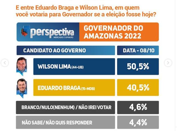 Para o governo do Amazonas, Wilson Lima teve 50,5% e Eduardo Braga 40,5%. Os votos brancos, nulos e não sabe responder totalizaram 9,0%.
