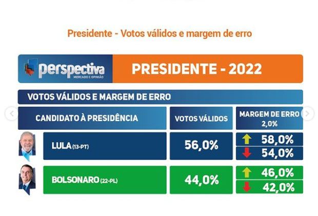 Ainda de acordo com a pesquisa Lula obteve 56,0% dos votos válidos; Bolsonaro 44,0%.