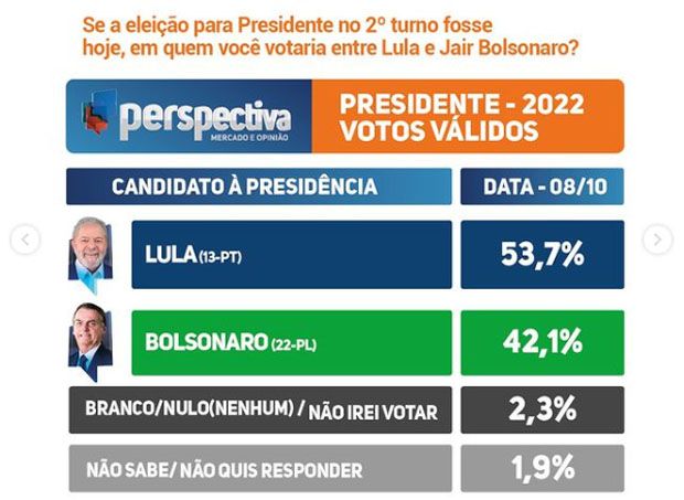 De acordo com a pesquisa, realizada entre os dias 3 e 7 deste mês, Lula teve 53,7% e Bolsonaro 42,1%. Os votos brancos, nulos e não sabe responder totalizaram 9,0%.