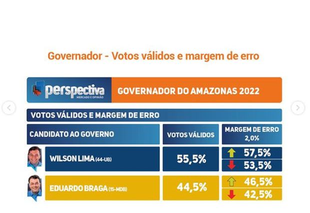 Ainda de acordo com a pesquisa Wilson Lima obtve 55,5% dos votos válidos; Eduardo Braga 44,5%.
