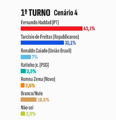 A pesquisa também testou um quadro sem a presença de Lula. Nesse caso, o ministro da Fazenda, Fernando Haddad (PT), aparece com 43,1% das intenções de voto, seguido de Tarcísio de Freitas, com 30,1%, e Ronaldo Caiado, com 7%.