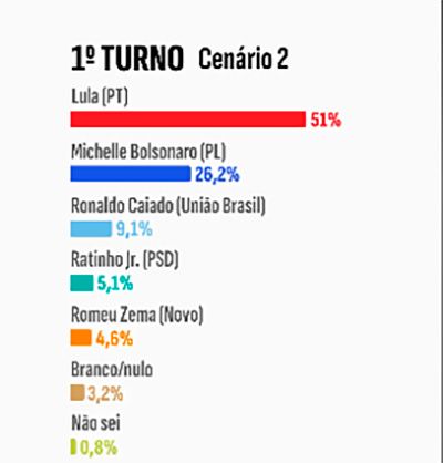 Em uma segunda simulação, o presidente mantém 51%, enquanto a ex-primeira-dama Michelle Bolsonaro (PL) registra 26,2%. Caiado soma 9,1%. Em um terceiro cenário, Lula continua com 51%, contra 15,3% de Caiado, 10,6% do governador mineiro Romeu Zema (Novo) e 10,4% de Ratinho Jr. (PSD), do Paraná.