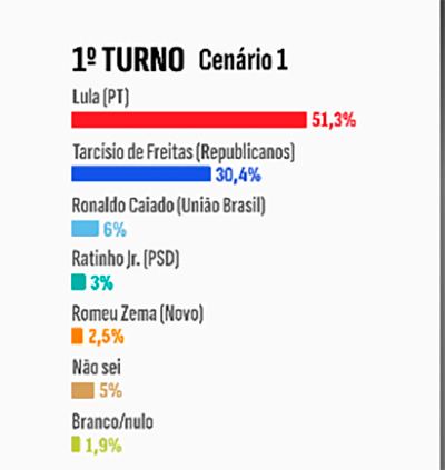 No primeiro cenário testado, Lula tem 51,3% das intenções de voto, seguido pelo governador de São Paulo, Tarcísio de Freitas (Republicanos), com 30,4%. O governador de Goiás, Ronaldo Caiado (União Brasil), aparece com 6%.