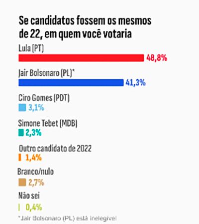 Lula chega a 52% das intenções de voto, enfrentando o governador de São Paulo, Tarcísio de Freitas (Republicanos), com 44%; a ex-primeira-dama Michelle Bolsonaro (PL), 43%; o ex-presidente Jair Bolsonaro (PL), 44%.