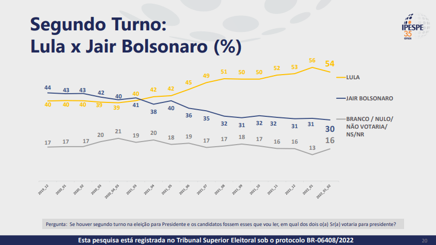 No segundo turno mais provável, entre Lula e Bolsonaro, o petista registra 54% das intenções de voto e o atual chefe do governo somente 30%.