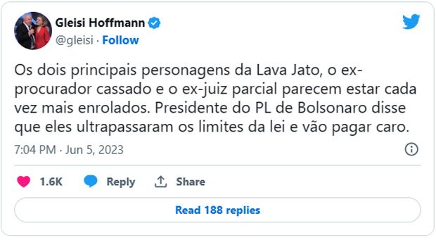 “Os dois principais personagens da Lava Jato, o ex-procurador cassado e o ex-juiz parcial parecem estar cada vez mais enrolados. Presidente do PL de Bolsonaro disse que eles ultrapassaram os limites da lei e vão pagar caro”, comentou, por exemplo, a deputada federal e presidente nacional do PT, Gleisi Hoffmann.