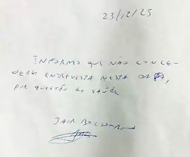 Bolsonaro cancela entrevista em bilhete escrito à mão,  alegado “questões de saúde”