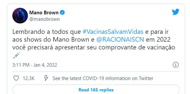“Lembrando a todos que vacinas salvam vidas e para ir aos shows do Mano Brown e Racionais MC’s em 2022 você precisará apresentar seu comprovante de vacinação”, escreveu o artista, recebendo em seguida o apoio dos fãs.